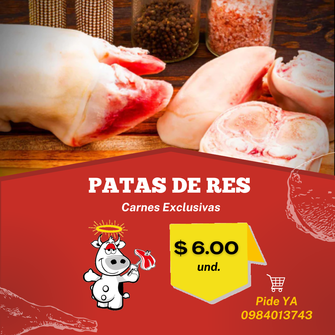 Las patas de res son la parte inferior de las extremidades del animal, conocidas por su alto contenido de colágeno y tejido conectivo. Aunque tienen poca carne, son muy valoradas en la cocina por la gelatina que liberan al cocinarse, lo que aporta cuerpo, textura y sabor intenso a caldos, sopas y guisos.